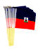 12" x 18" Haiti stick flags are great for parades, sporting events, rallies and special event decorations. The flags are made of polyester with the design crisp on both sides of the flag and sold in packs of 12. All four sides of the flag are stitched and each flag is mounted with a pole hem to a 24" wood staff with a gold spear on top.