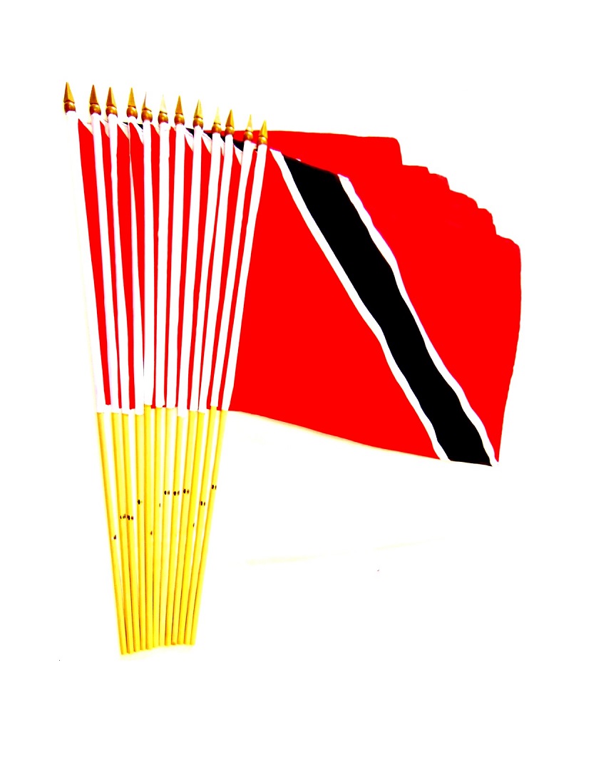 12" x 18" Trinidad/Tobago flags are great for parades, sporting events, rallies and special event decorations. The flags are made of polyester with the design crisp on both sides of the flag and are sold in packs of 12. All four sides of the flag are stitched and each flag is mounted with a pole hem to a 24" wood staff with a gold spear top.