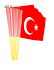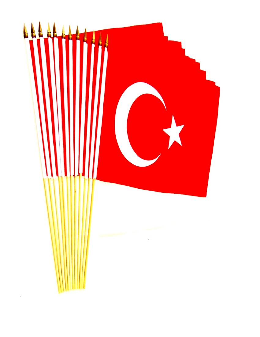 12" x 18" Turkish flags are great for parades, sporting events, rallies and special event decorations. The flags are made of polyester with the design crisp on both sides of the flag and are sold in packs of 12. All four sides of the flag are stitched and each flag is mounted with a pole hem to a 24" wood staff with a gold spear top.