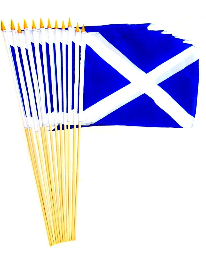 12" x 18" Scotland Cross flags are great for parades, sporting events, rallies and special event decorations. The flags are made of polyester with the design crisp on both sides of the flag and are sold in packs of 12. All four sides of the flag are stitched and each flag is mounted with a pole hem to a 24" wood staff with a gold spear top.