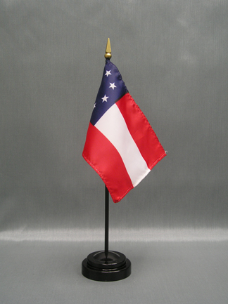 Beautifully printed on silk-like material, these 4"x6" miniature 1st Confederate stick flags offer the highest quality in a mounted desk or table top flag. They are carefully hem-stitched on all 4 sides for longer lasting beauty and are attached to a 3/16" x 10" black plastic staff with a gold spear.