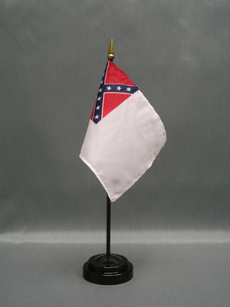 Beautifully printed on silk-like material, these 4"x6" miniature 2nd Confederate stick flags offer the highest quality in a mounted desk or table top flag. They are carefully hem-stitched on all 4 sides for longer lasting beauty and are attached to a 3/16" x 10" black plastic staff with a gold spear.