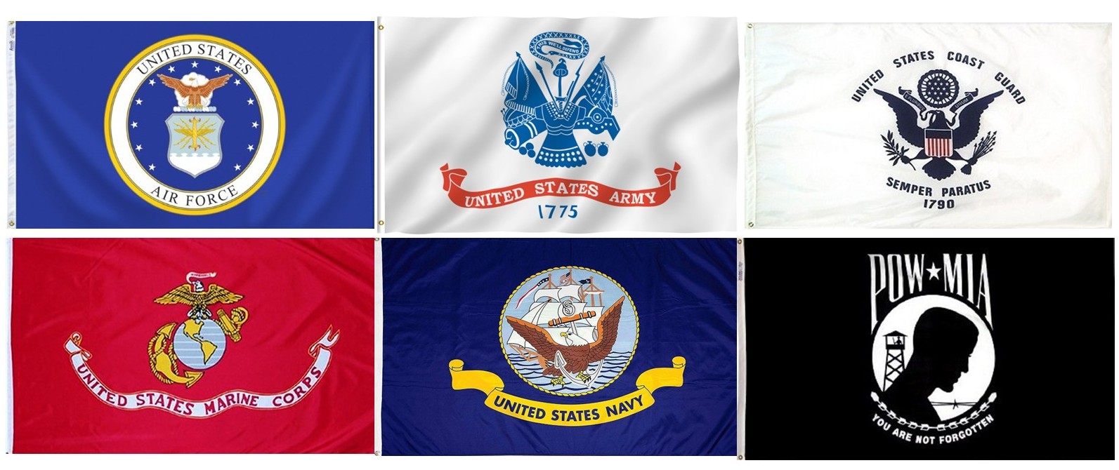 Each set includes one 3x5 foot polyester flag of the Army, Air Force, Marines, Navy, Coast Guard, and POW/MIA flag.