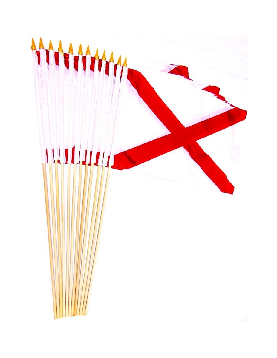 These popular 12"x18" Alabama miniature stick flags are perfect for parades, special events, classroom decorations or souvenirs. They are made of a polyester material which is stitched on all sides and attached to a 30" wood pole with a sewn pole hem.