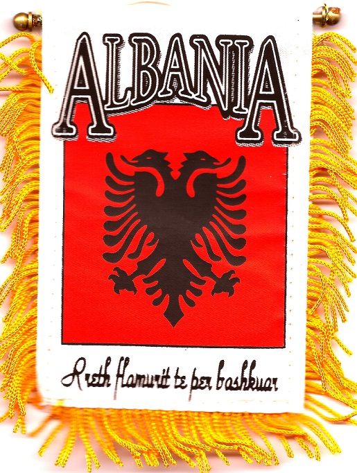Albania car windshield, window or mirror mini banner flags measure 3 1/2 x 5 inches; and are great ways to show your heritage. Each flag has a gold fringe with a string for hanging over your car mirror, and a suction cup to attach the mini flag to your windshield or car window.