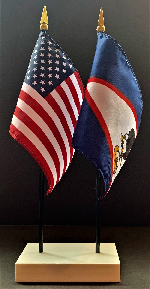 Elevate your workspace with our American Samoa and American miniature flag desk set! These silk-like rayon flags, measuring 4x6 inch and are attached to a 10 inch black plastic staff and finished with a gold spear top. Perfect for office, classroom, or table decor. Each set comes with a 4 inch long white flag stand for added display options.