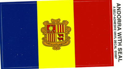 Special closeout sale. Buy 25 or more Andorra vinyl waterproof flag decals and the price is only 40 cents each.