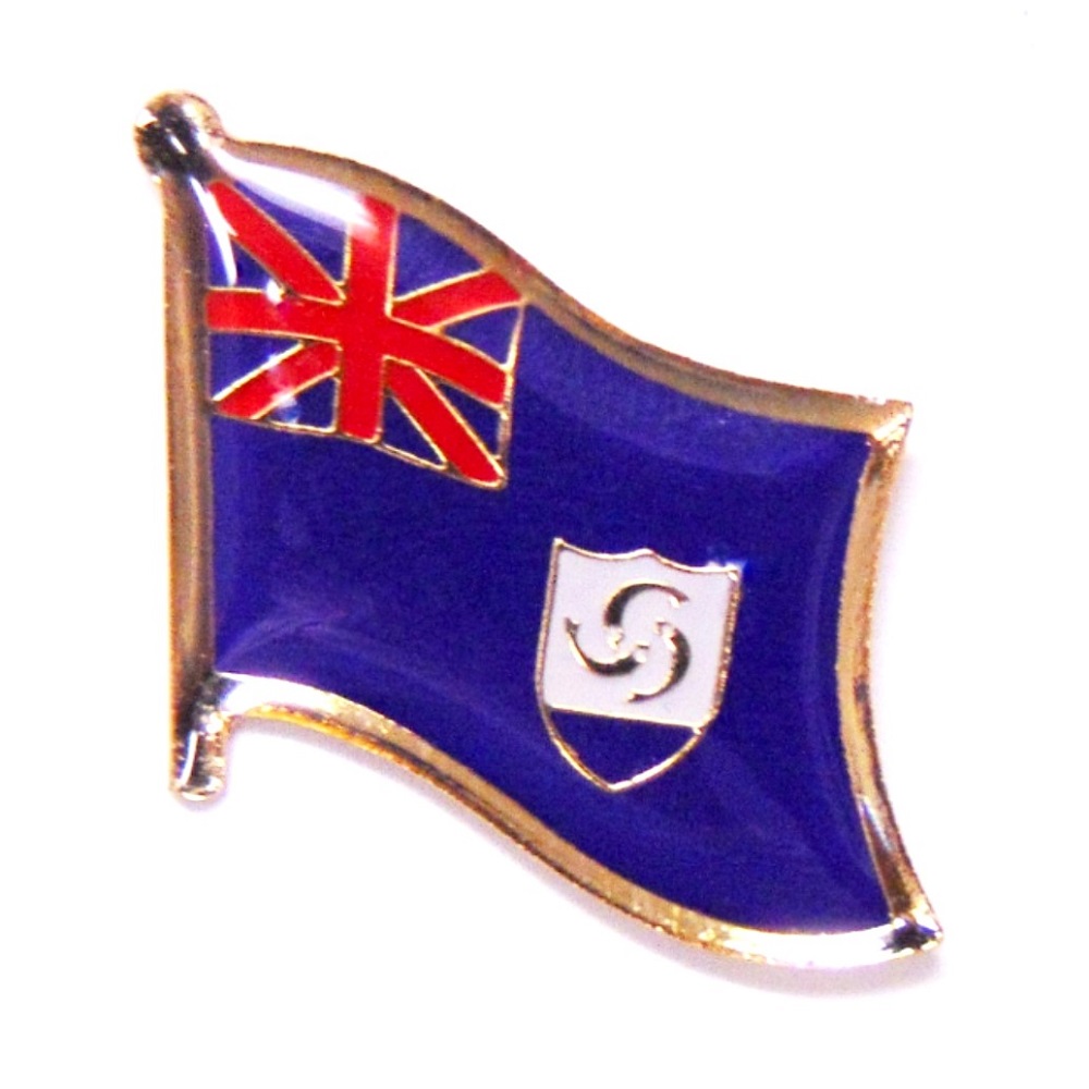 Anguilla single flag lapel pins depict one waving flag. Each Anguillan flag pin measures approximately 1" x 3/4" or 24 mm x 16