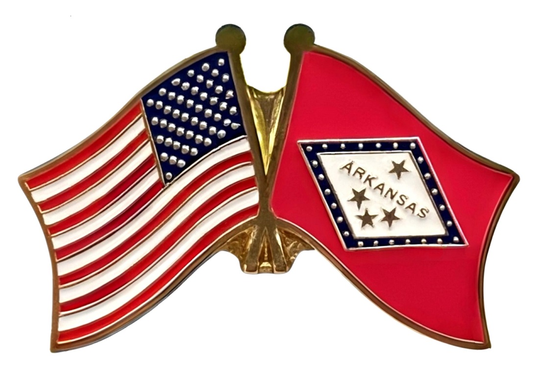 Each Arkansas flag friendship lapel pin depicts the US flag on the left along with the Arkansas flag on the right. Each pin measures approximately 1" x 3/4" or 28mm x 18.3mm and is the same quality as the single flag lapel pins.