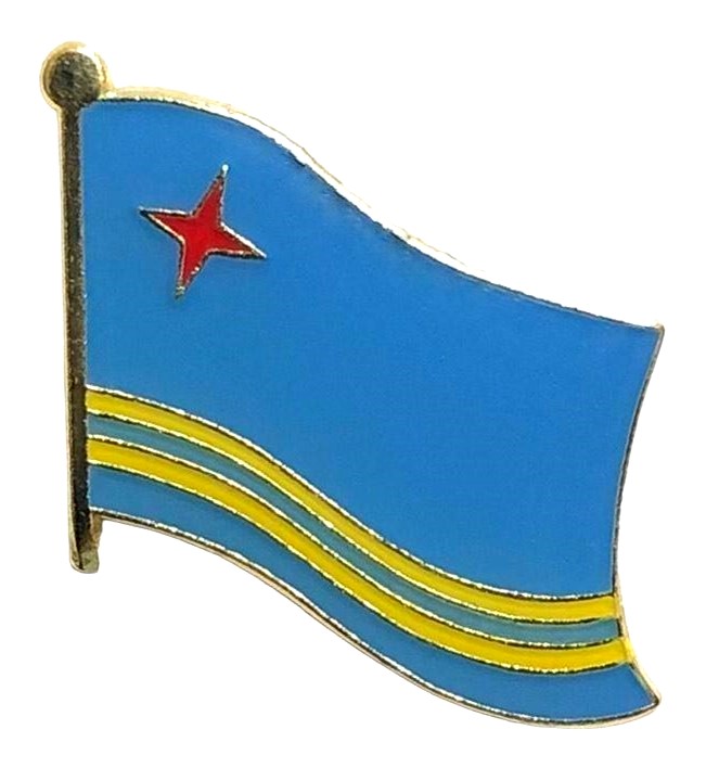 Aruba flag pin measures approximately 1 inch; x 3/4 inch; or 24 mm x 16 mm and has an all metal lacquered design with clutch pin.