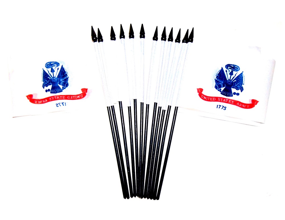 These Army polyester table flags are great for special events, parades and party decorations. They are priced less than the top quality rayon desk flags and are sold only in packs of 12 per order unit. Only $1.00 each. Each Department of the Army miniature flag measures 4"x6" and is attached with a pole hem to a 10" black plastic staff with a black spear top.