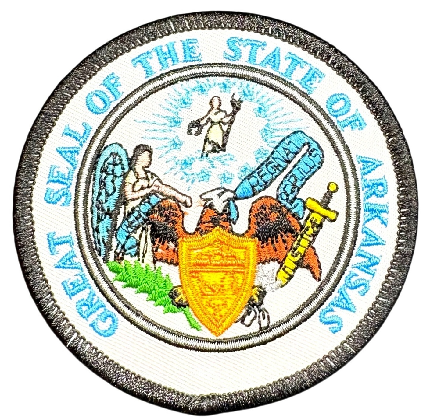 Arkansas State Seal Patches are fully embroidered and measure 3 inches in diameter. These state seal patches can be ironed on or sewn on. Quantity discounts apply.