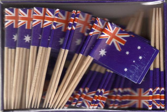 Miniature Australia flag toothpick flags make great party and dinner decorations. Each box has 100 flag toothpicks. Each miniature flag is approximately 1″ x 1 1/2″ mounted on a 2 1/2″ toothpick.