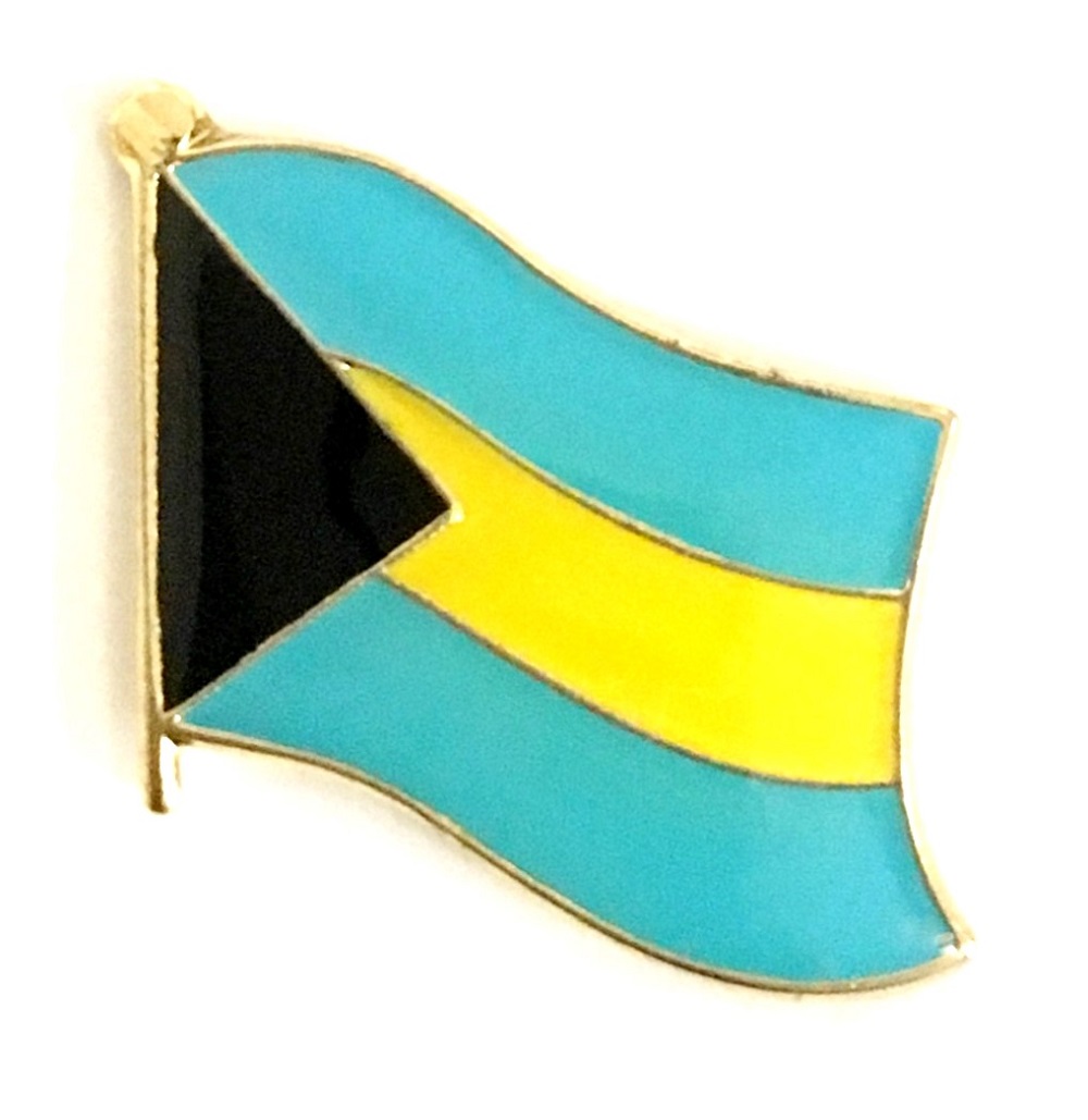 Bahamas flag pin measures approximately 1 inch; x 3/4 inch; or 24 mm x 16 mm and has an all metal lacquered design with clutch pin.