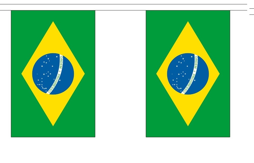 Brazilian string flag bunting is available in two sizes, 10′ string with 10 6″x9″ polyester flags or 30' string with 30 6″x9″ polyester flags. Several 10′ sections can be tied together for a longer length and the 30′ strings can be cut to fit the size that you need in the space available.