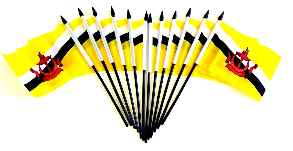 These Brunei polyester table flags are great for special events, parades and party decorations. They are priced less than the top quality rayon desk flags and are sold only in packs of 12 per order unit. Each Brunei miniature flag measures 4″x6″ and is attached with a pole hem to a 10″ black plastic staff with a black spear top.