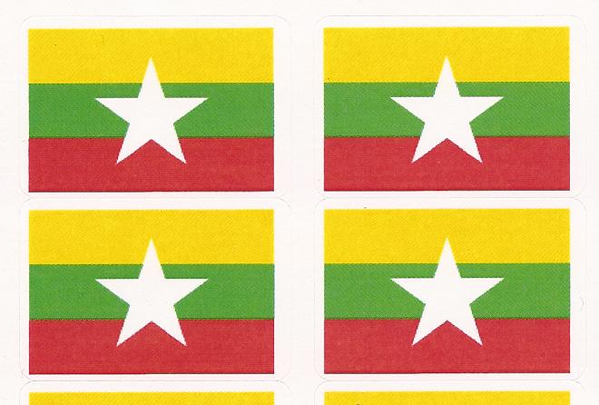 Myanmar (Burma) flag stickers are printed 50 to the sheet. Each Myanmar (Burma) flag sticker measures 1" x 1.5" and is self adhesive.