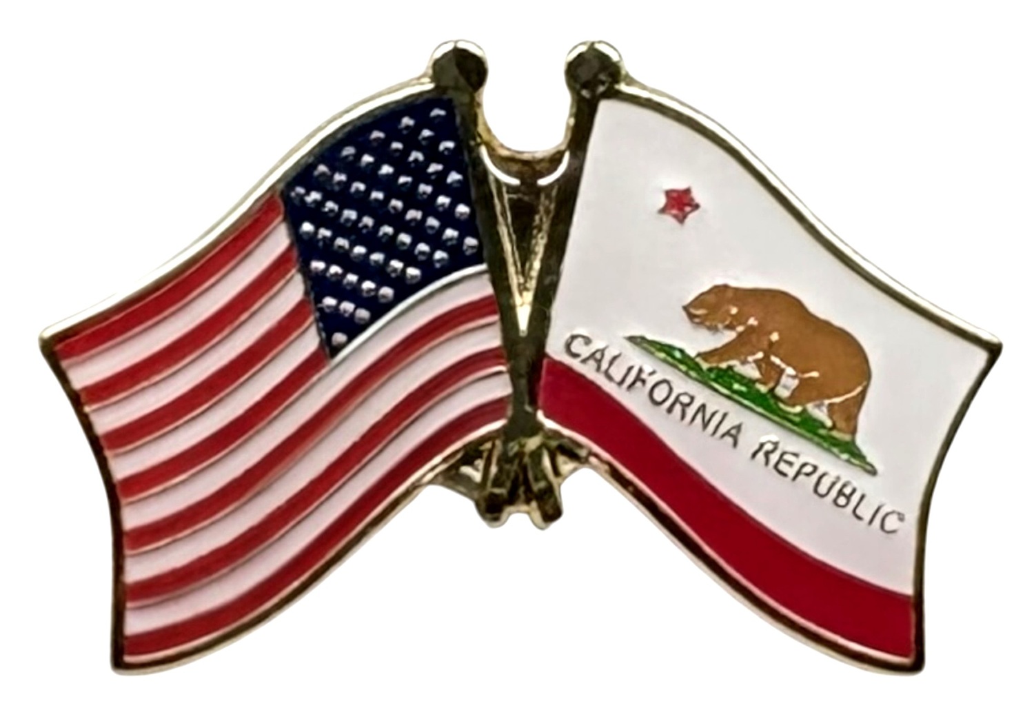 Each California flag friendship lapel pin depicts the US flag on the left along with the California flag on the right. Each pin measures approximately 1" x 3/4" or 28mm x 18.3mm and is the same quality as the single flag lapel pins.