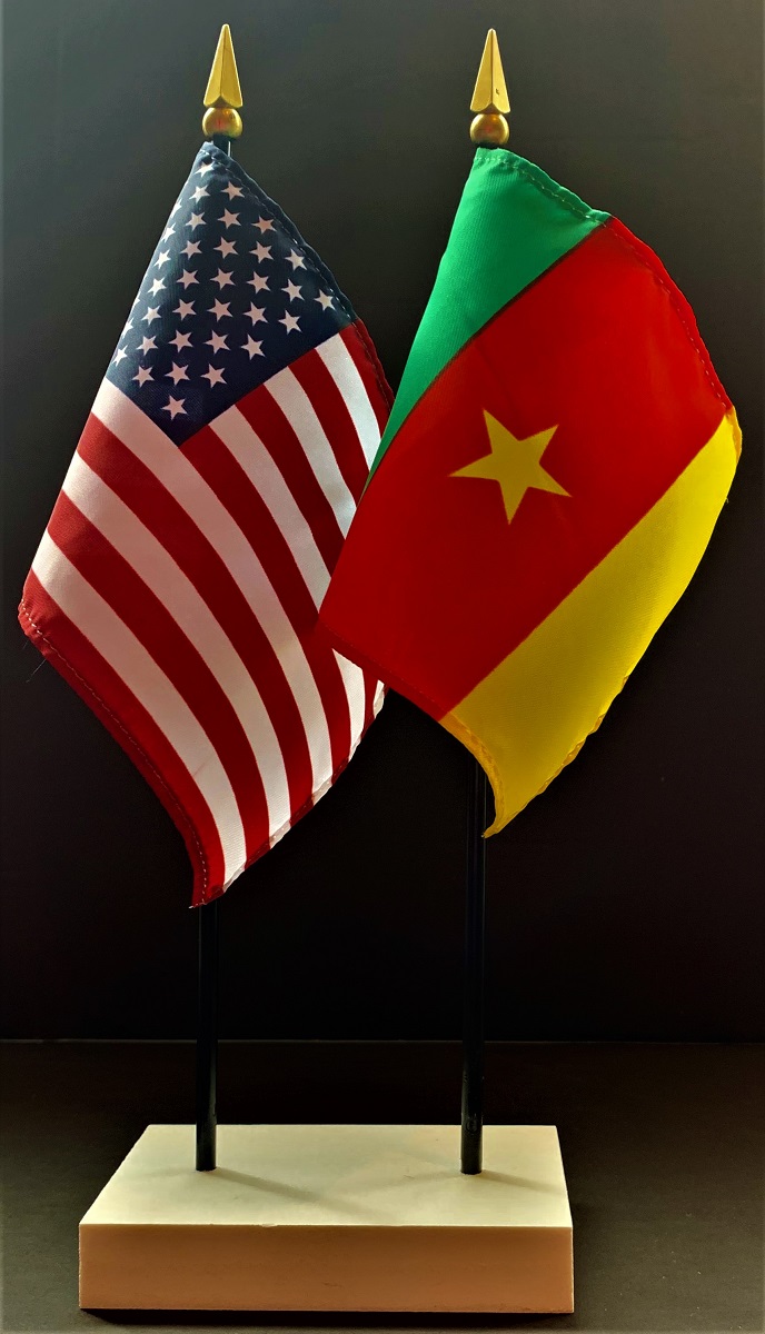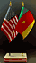 Elevate your workspace with our Cameroon and American miniature flag desk set! These silk-like rayon flags, measuring 4x6 inch and are attached to a 10 inch black plastic staff and finished with a gold spear top. Perfect for office, classroom, or table decor. Each set comes with a 4 inch long white flag stand for added display options.