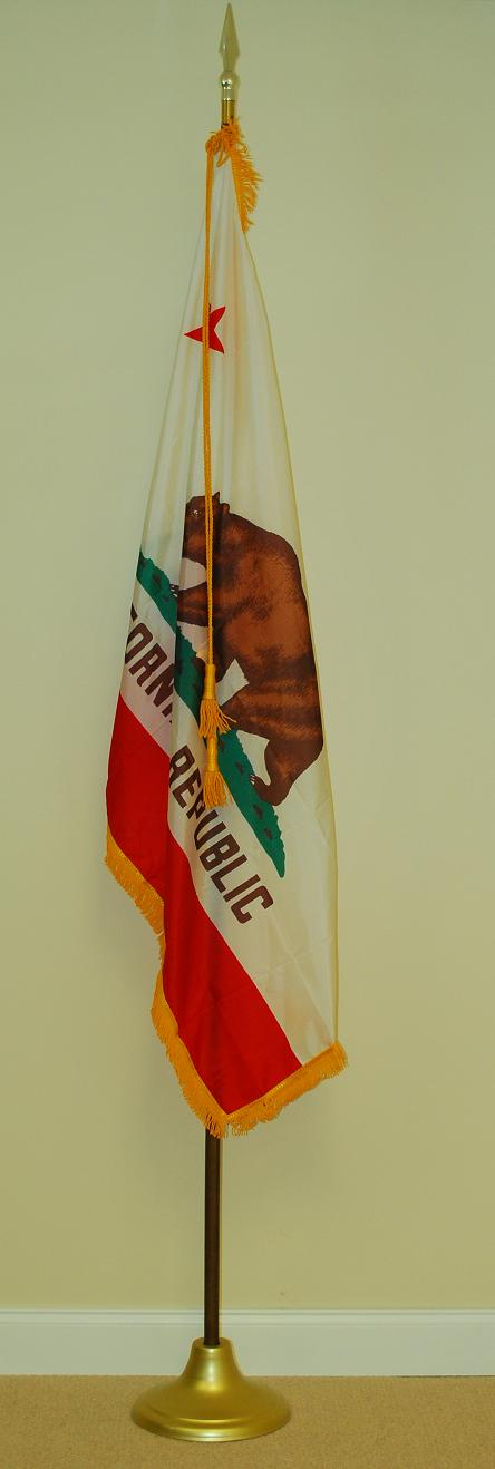 Click photo for larger image. Each State of California indoor flag set includes the 3'x5' gold fringed nylon California state flag with lined pole heading, leather tabs, cord and tassels, 8' polished oak pole with solid brass joint, heavy metal gold anodized stand, and gold plated 7 1/2" metal spear. (American Flag set sold separately).