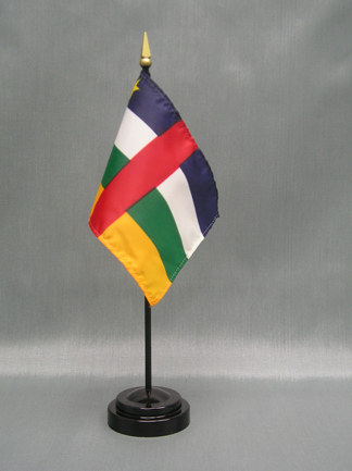 These miniature Central African Republic 4x6 inch; stick flags are beautifully printed on silk-like material. Each flag is carefully hem-stitched on all 4 sides for longer lasting beauty. They are attached to a 10 inch; black plastic staff with a gold spear making these international flags perfect for desktop or tabletop displays.