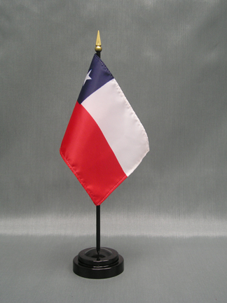 Chile 4x6 inch; stick flags are beautifully printed on silk-like material. Each flag is carefully hem-stitched on all 4 sides for longer lasting beauty. They are attached to a 10 inch; black plastic staff with a gold spear making these international flags perfect for desktop or tabletop displays.