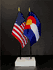 This high quality State and US miniature flag desk set is perfect for office, classroom and table decorations. Flags are made of silk-like rayon, measure 4"x6" and are attached to 10" black plastic staff with a gold spear top. All edges are hem stitched. Flag stand measures 4" long, 2.5" wide and stands .75" high.