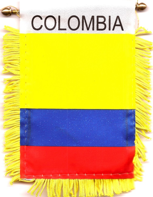 Colombia car windshield, window or mirror mini measure 3 1/2 x 5 inches; and are great ways to show your heritage. Each flag has a gold fringe with a string for hanging over your car mirror, and a suction cup to attach the mini flag to your windshield or car window.