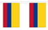 Colombia string flag bunting is available in two sizes, 10′ string with 10 6″x9″ polyester flags or 30′ string with 30 6″x9″ polyester flags. Several 10′ sections can be tied together for a longer length and the 30′ strings can be cut to fit the size that you need in the space available.