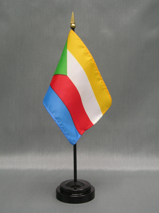 These miniature Comoros 4x6 inch; stick flags are beautifully printed on silk-like material. Each flag is carefully hem-stitched on all 4 sides for longer lasting beauty. They are attached to a 10 inch; black plastic staff with a gold spear making these international flags perfect for desktop or tabletop displays.