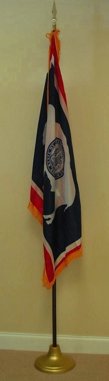 Click photo for larger image. Each State of Colorado indoor flag set includes the 3'x5' gold fringed nylon Colorado state flag with lined pole heading, leather tabs, cord and tassels, 8' polished oak pole with solid brass joint, heavy metal gold anodized stand, and gold plated 7 1/2" metal spear. (American Flag set sold separately).