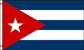 These standard size 3'x5' nylon imported Cuban flags are fully printed with the flag image on both sides. Each flag has two grommets attached which are used for hanging the flag on a wall or on a flag pole. The fly end has four rows of stitching and the other three sides are double stitched. These flags are suitable for full time outdoor use.