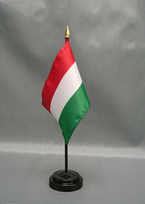These miniature Hungary 4x6 inch; stick flags are beautifully printed on silk-like material. Each flag is carefully hem-stitched on all 4 sides for longer lasting beauty. They are attached to a 10 inch; black plastic staff with a gold spear making these international flags perfect for desktop or tabletop displays.