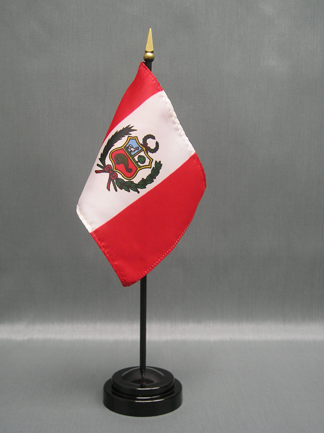 These miniature Peru 4x6 inch; stick flags are beautifully printed on silk-like material. Each flag is carefully hem-stitched on all 4 sides for longer lasting beauty. They are attached to a 10 inch; black plastic staff with a gold spear making these international flags perfect for desktop or tabletop displays.