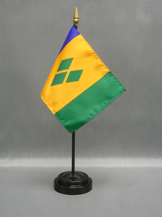 These miniature St Vincent & Grenades 4x6 inch; stick flags are beautifully printed on silk-like material. Each flag is carefully hem-stitched on all 4 sides for longer lasting beauty. They are attached to a 10 inch; black plastic staff with a gold spear making these international flags perfect for desktop or tabletop displays.