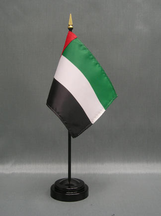 These miniature United Arab Emirates 4″x6″ stick flags are beautifully printed on silk-like material. Each flag is carefully hem-stitched on all 4 sides for longer lasting beauty. They are attached to a 3/16″ x 10″ black plastic staff with a gold spear making these international flags perfect for desktop or tabletop displays.