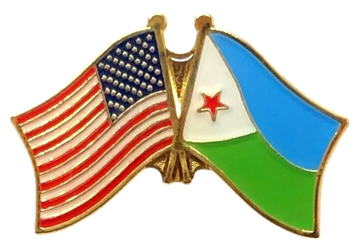 Each Djibouti flag friendship lapel pin depicts the US flag on the left along with the Djibouti flag on the right. Each pin measures approximately 1" x 3/4" or 28 mm x 18.3 mm and is the same quality as the single flag lapel pins.