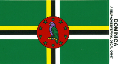 Special closeout sale. Buy 25 or more Dominica vinyl waterproof flag decals and the price is only 40 cents each.