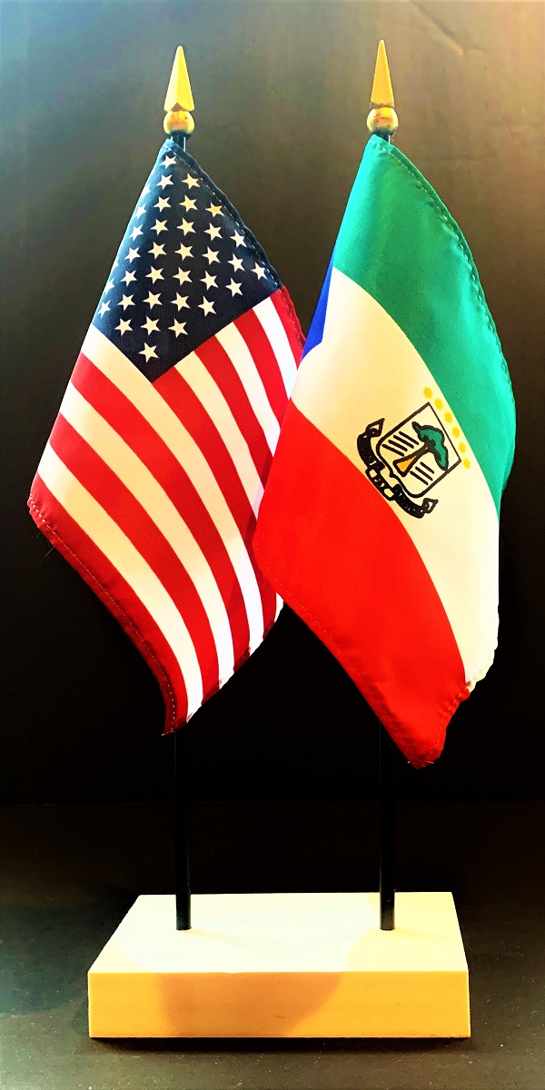 Elevate your workspace with our Equatorial New Guinea and American miniature flag desk set! Thesmeasuring 4x6 inch and are attached to a 10 inch black plastic staff and finished with a gold spear top. Perfect for office, classroom, or table decor. Each set comes with a 4 inch long white flag stand for added display options.