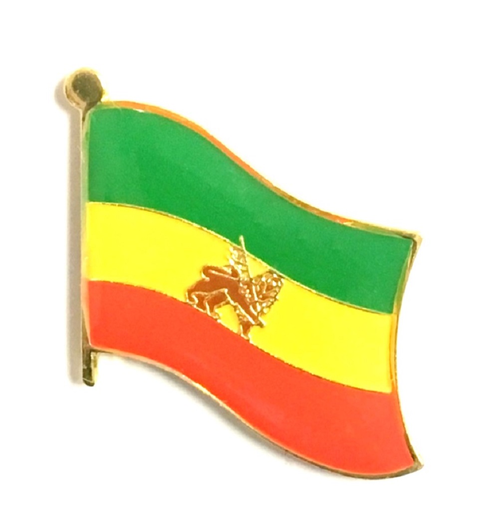 Ethiopia w/Lion flag pin measures approximately 1 inch; x 3/4 inch; or 24 mm x 16 mm and has an all metal lacquered design with clutch pin.