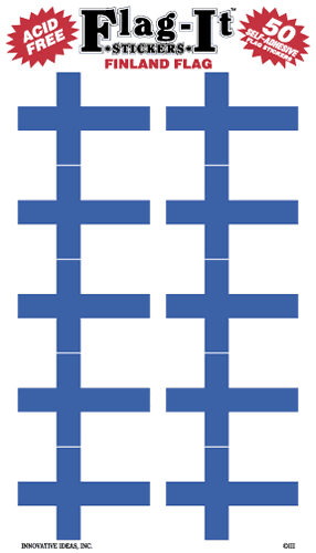Each package contains 50 self adhesive Finnish flag stickers measuring 1"x1 1/2" each. Excellent for school projects and envelope decorations. Sticks to any smooth surface.