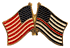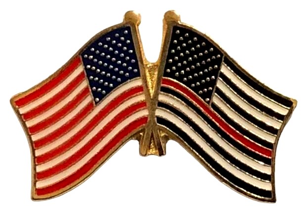 Fire Memorial flag friendship lapel pin depicts the US flag on the left along with the Fire Memorial flag on the right. Each pin measures approximately 1" x 3/4" or 28 mm x 18.3 mm and is the same quality as the single flag lapel pins.