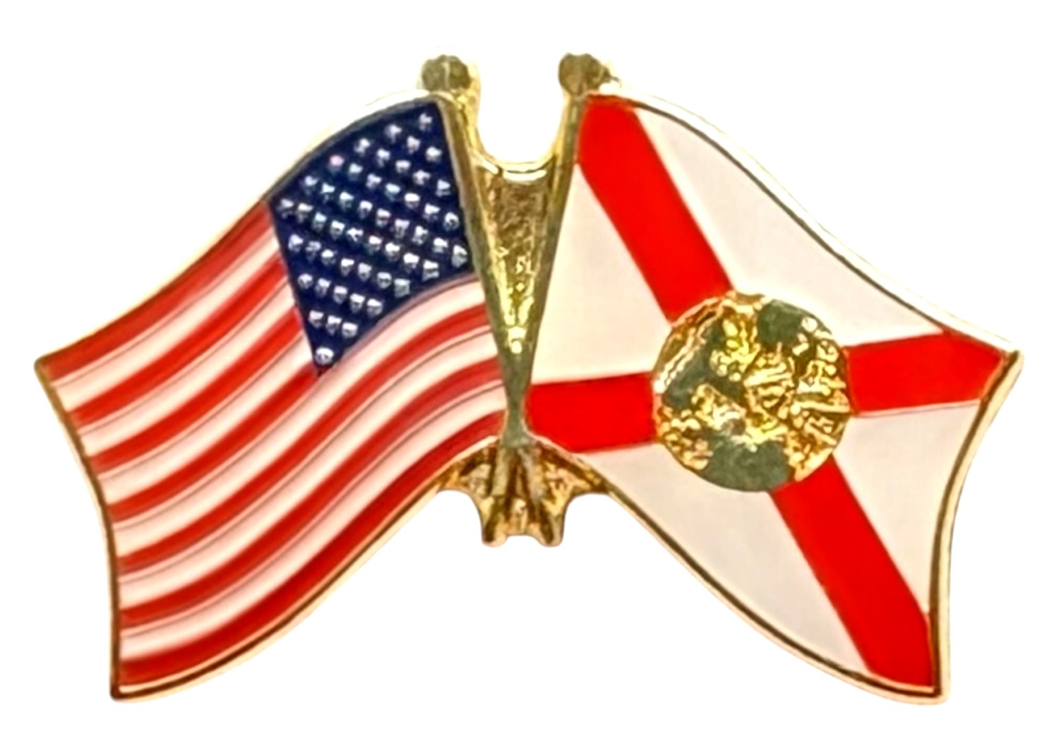 Each Florida flag friendship lapel pin depicts the US flag on the left along with the Florida flag on the right. Each pin measures approximately 1" x 3/4" or 28mm x 18.3mm and is the same quality as the single flag lapel pins.