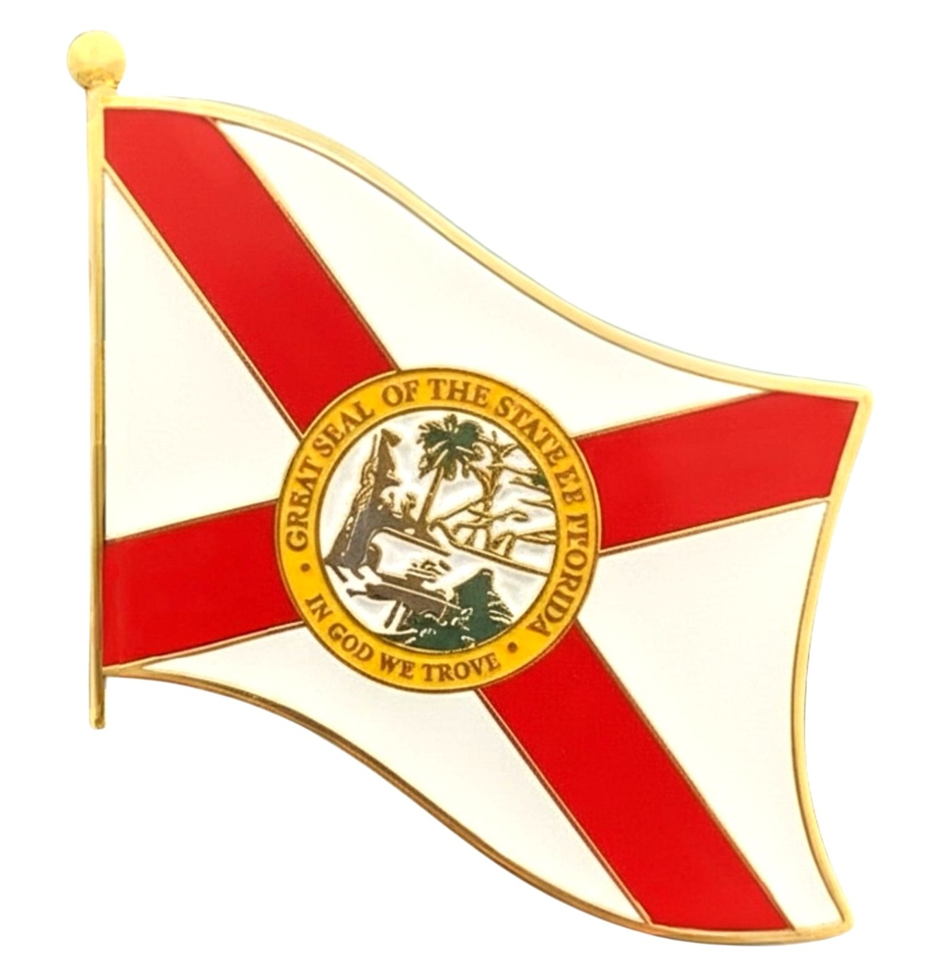 Florida single flag lapel pins depict one waving flag. Each Florida flag pin measures approximately 1" x 3/4" or 24 mm x 16 mm and has an all metal lacquered design with clutch pin.