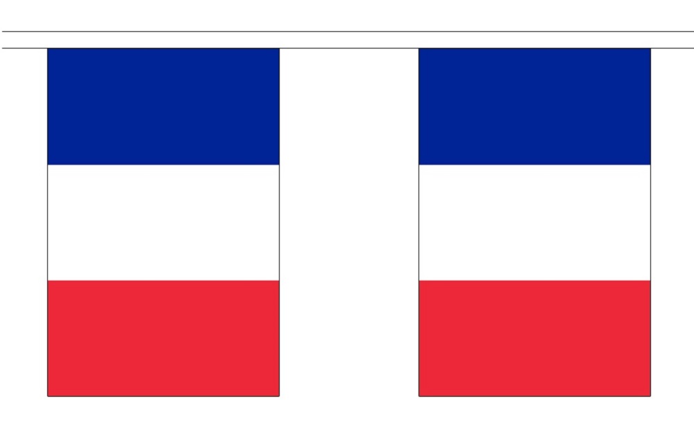 French string flag bunting is available in a 10′ string with 10 6″x9″ polyester flags. Several 10′ sections can be tied together for a longer length.