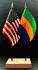 Elevate your workspace with our Gabon and American miniature flag desk set! These silk-like rayon flags, measuring 4x6 inch and are attached to a 10 inch black plastic staff and finished with a gold spear top. Perfect for office, classroom, or table decor. Each set comes with a 4 inch long white flag stand for added display options.