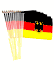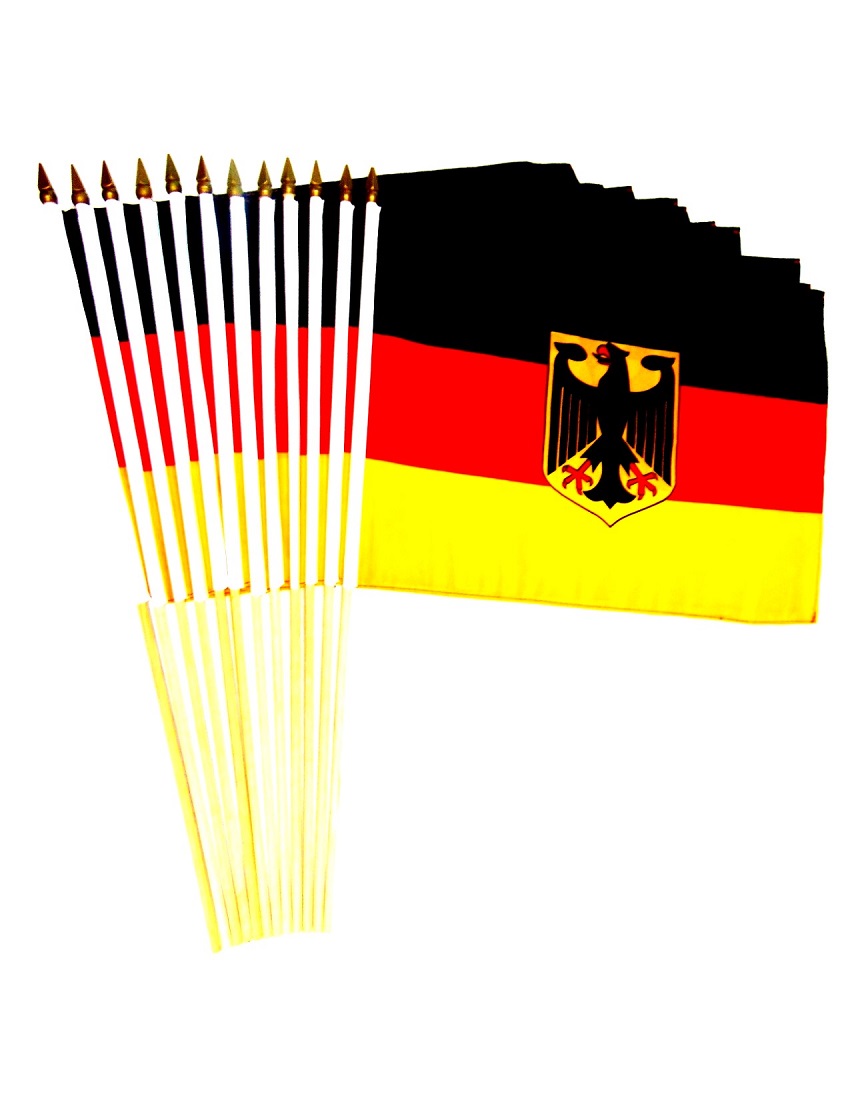 12" x 18" German flags are great for parades, sporting events, rallies and special event decorations. The flags are made of polyester with the design crisp on both sides of the flag. All four sides of the flag are stitched and each flag is mounted with a pole hem to a 24" wood staff with a gold spear top.