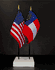 This high quality State and US miniature flag desk set is perfect for office, classroom and table decorations. Flags are made of silk-like rayon, measure 4"x6" and are attached to 10" black plastic staff with a gold spear top. All edges are hem stitched. Flag stand measures 4" long, 2.5" wide and stands .75" high.