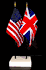 Elevate your workspace with our Great Britain and American miniature flag desk set! These silk-like rayon flags, measuring 4"x6", are attached to a 10" black plastic staff and finished with a gold spear top. Perfect for office, classroom, or table decor. Each set comes with a 4" long white flag stand for added display options.