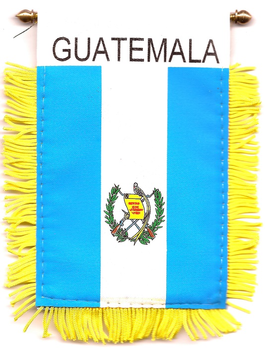 Guatemala car windshield, window or mirror mini banner flags measure 3 1/2" x 5" and are great ways to show your Guatemalan heritage. Each flag has a gold fringe with a string for hanging over your car mirror, and a suction cup to attach the mini flag to your windshield or car window.
